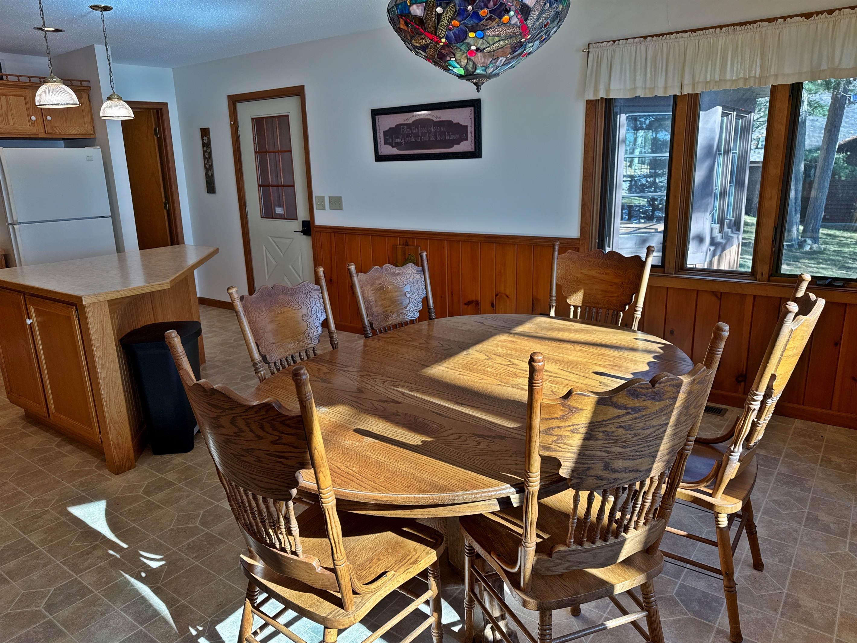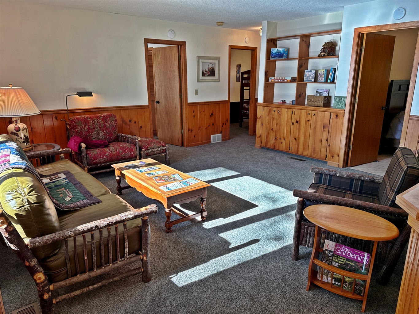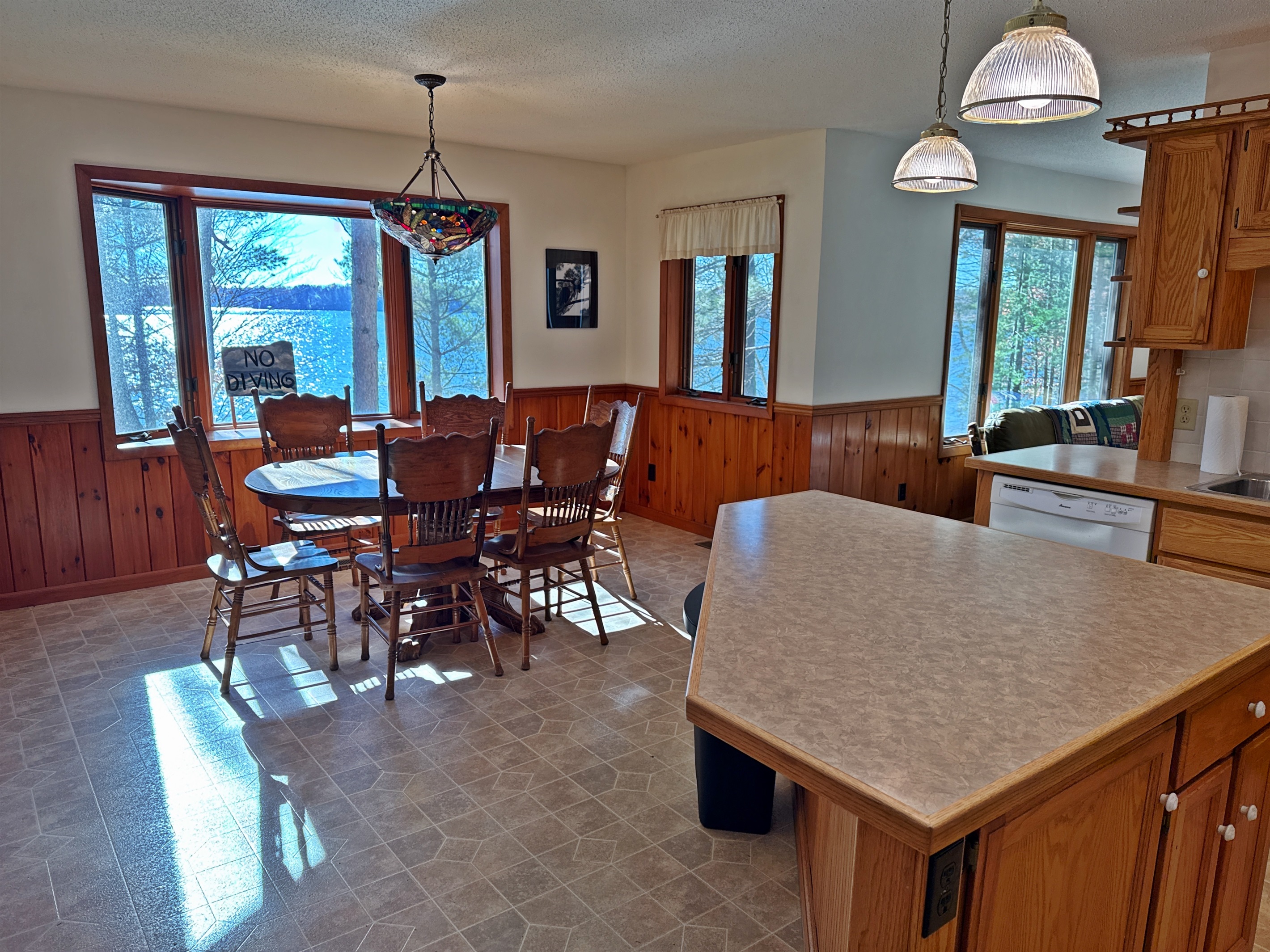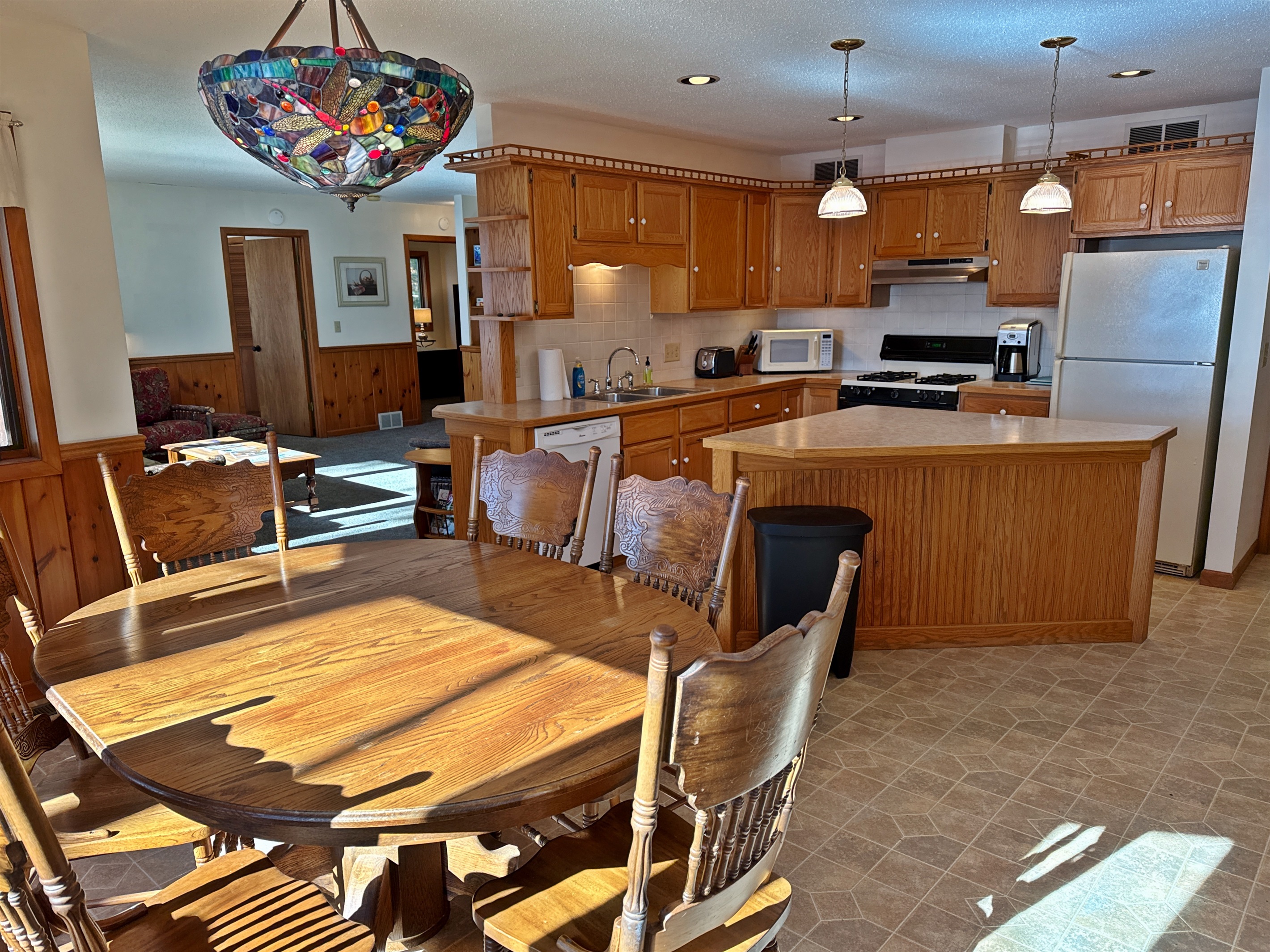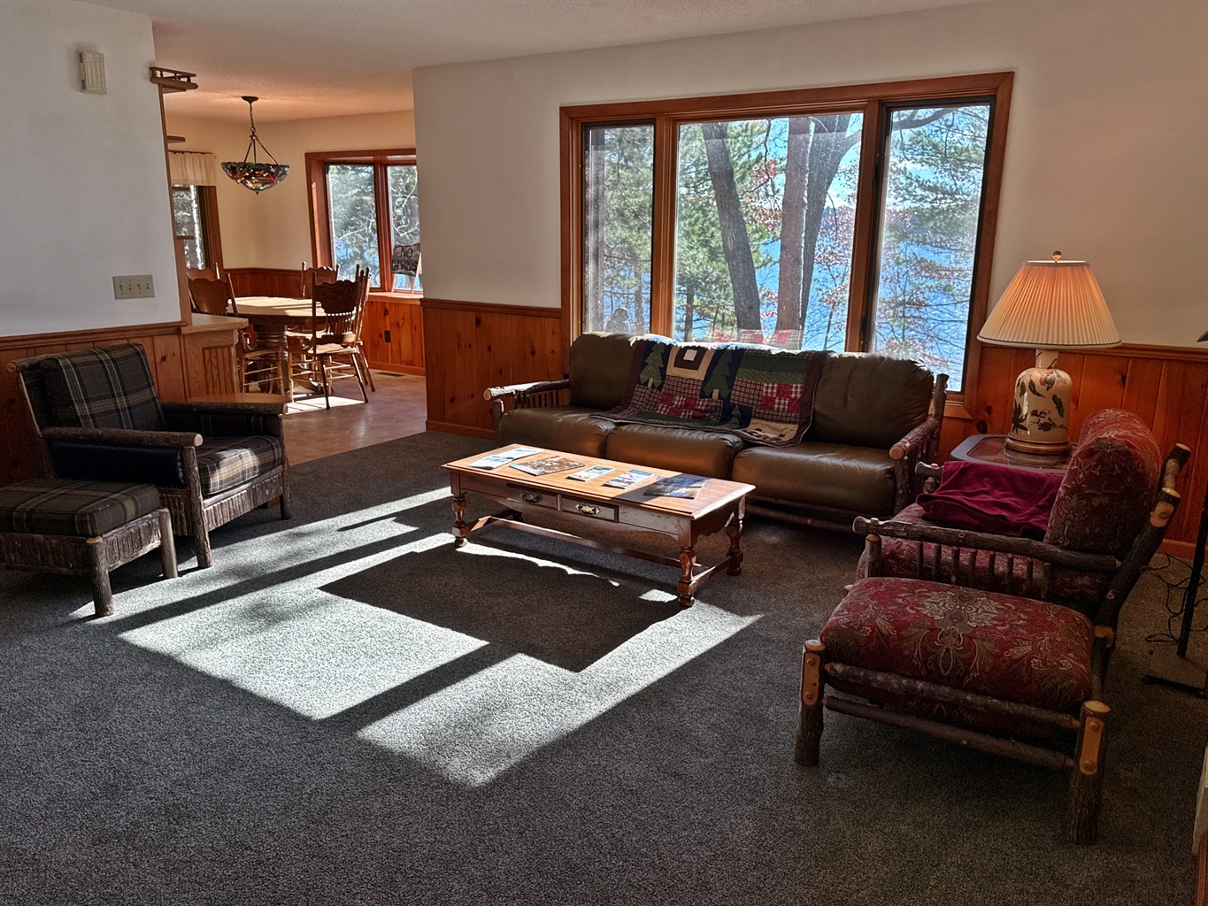 Step inside to find a warm, welcoming space with all the essentials for a relaxing stay. The bright, open-concept living area features large windows overlooking the lake and a comfortable sitting area perfect for morning coffee or evening games. The kitchen is fully equipped with a stove, refrigerator, microwave, and coffee maker, and the dining space is great for shared meals or rainy-day puzzles. A three-season porch brings the outdoors in and offers a wonderful place to relax or watch the sunset.