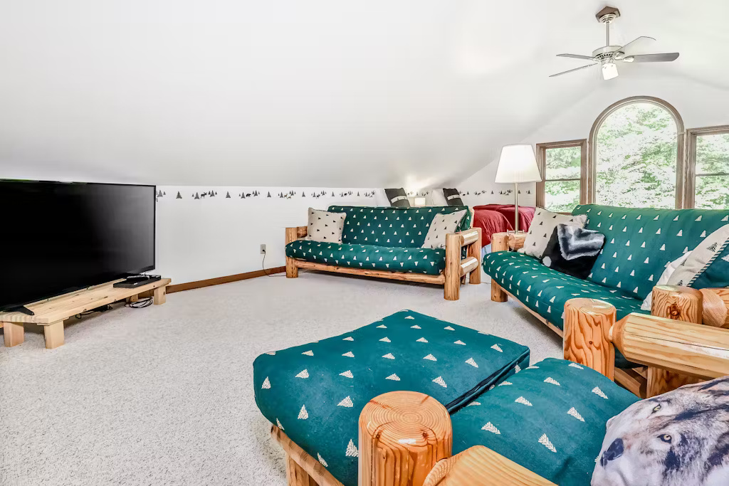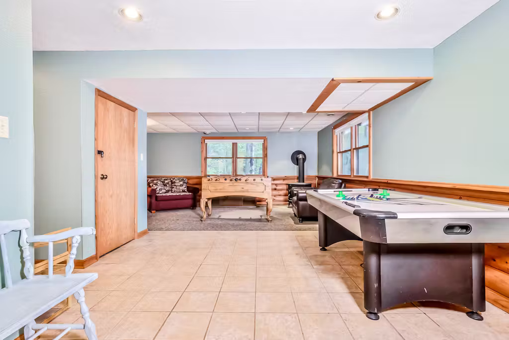 The upper-level bunk room is a kid’s paradise, offering a gaming/movie area, five twin beds, two futons, and even its own dining table—perfect for young and older kids to hang out together. The lower-level game room adds even more fun, with foosball, Pac-Man, and air hockey for hours of entertainment.