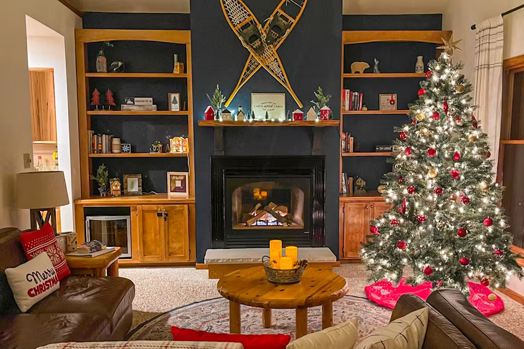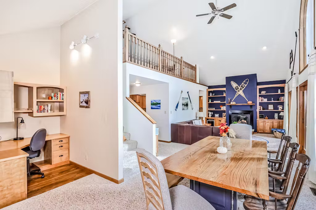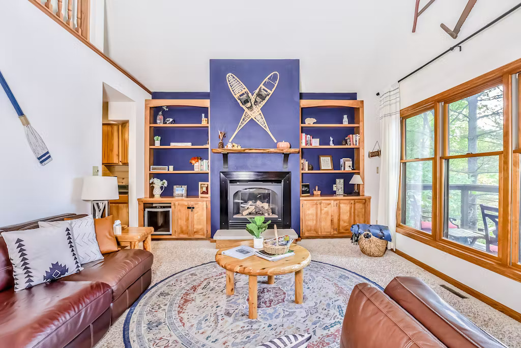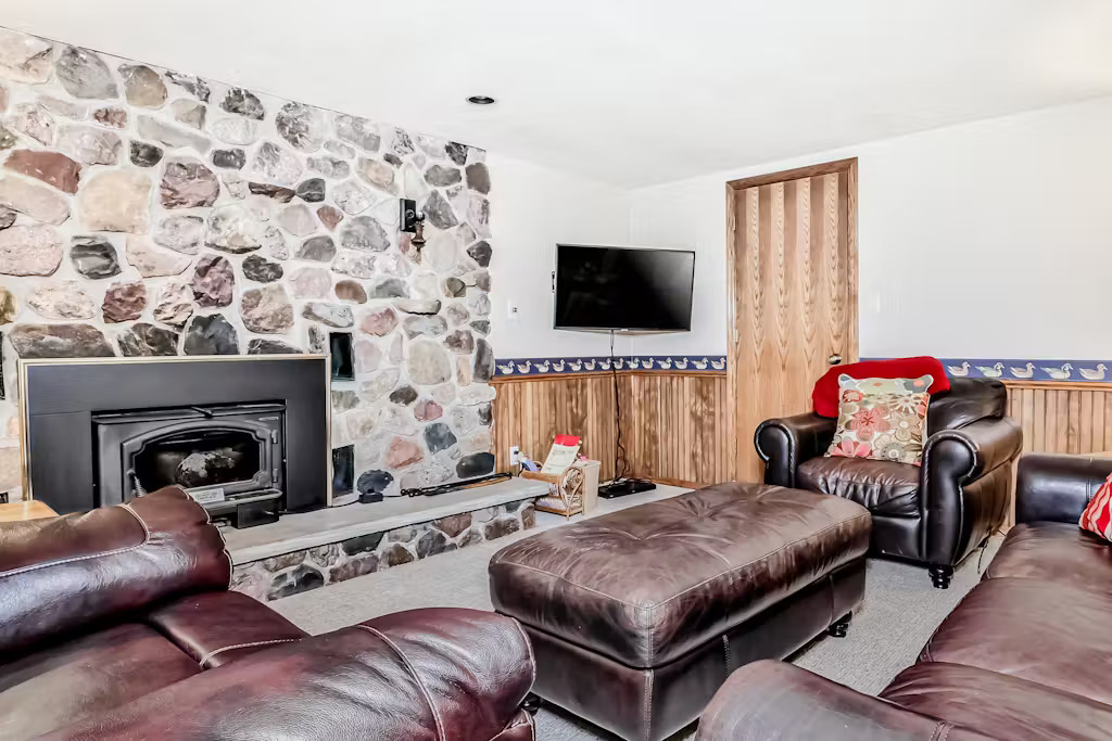 The home spans two levels of comfort, featuring a bright, spacious living area with tasteful décor, a cozy gas fireplace, and two full kitchens, making it ideal for large family gatherings or groups.