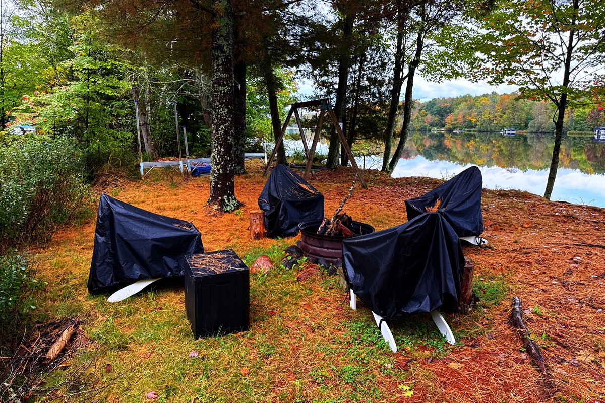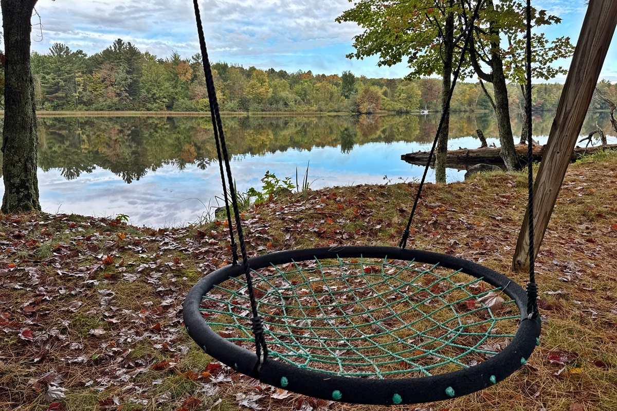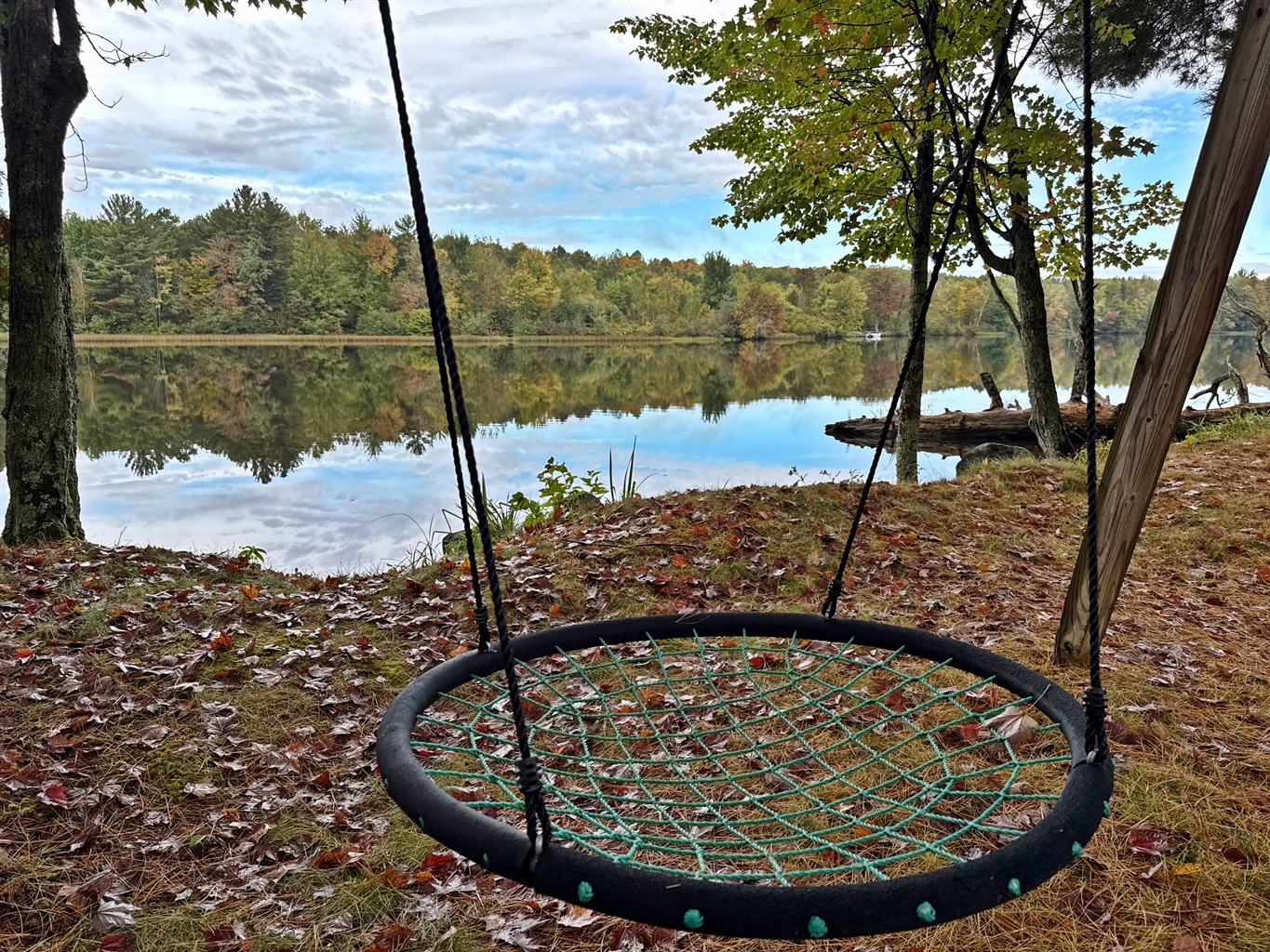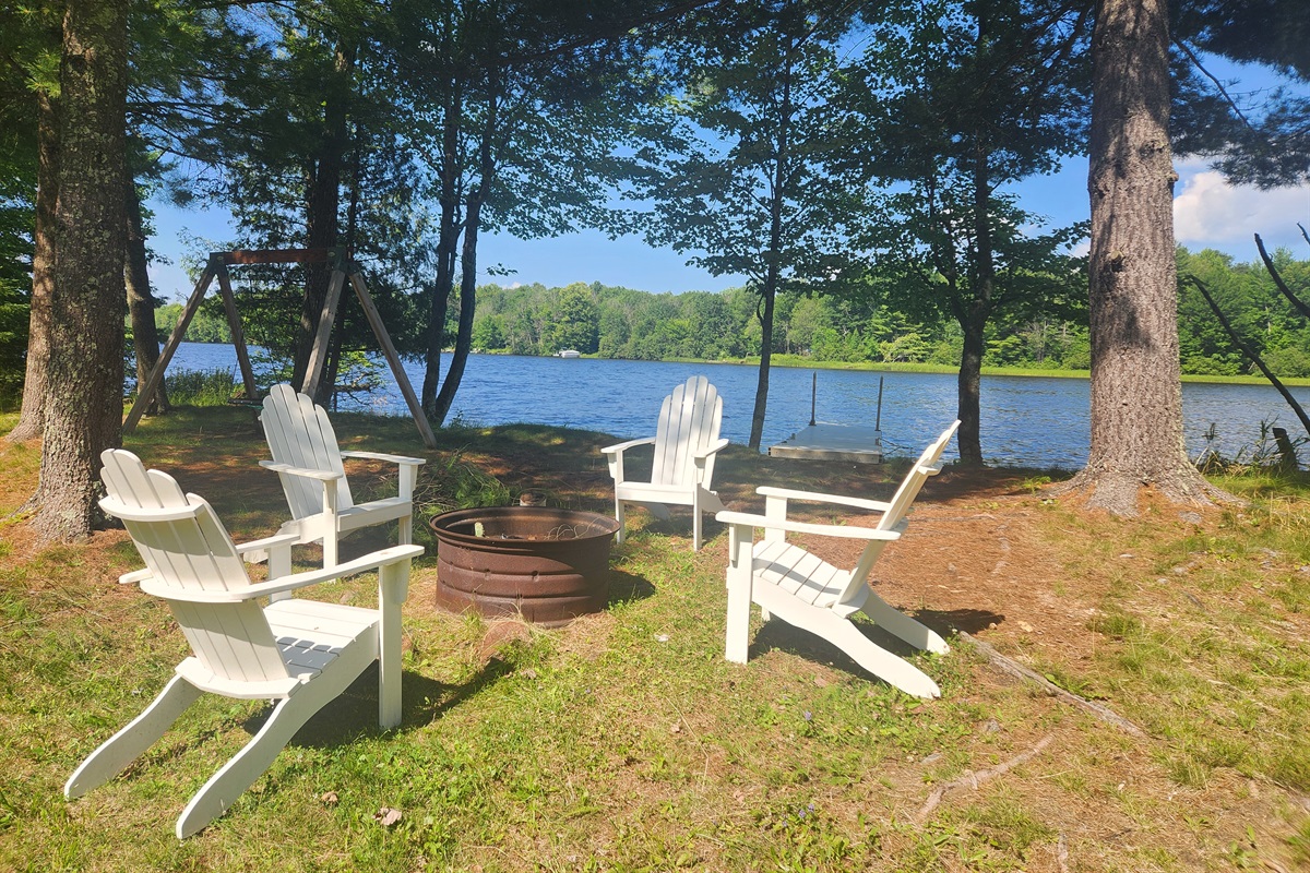 The cabin includes three kayaks, a lily pad, small inflatables, a 30-foot private dock, basic fishing gear, a hammock, swing by the water, fire pit, and charcoal grill. There’s even a small lagoon that’s perfect for catching frogs in summer or ice skating in winter (weather permitting).
