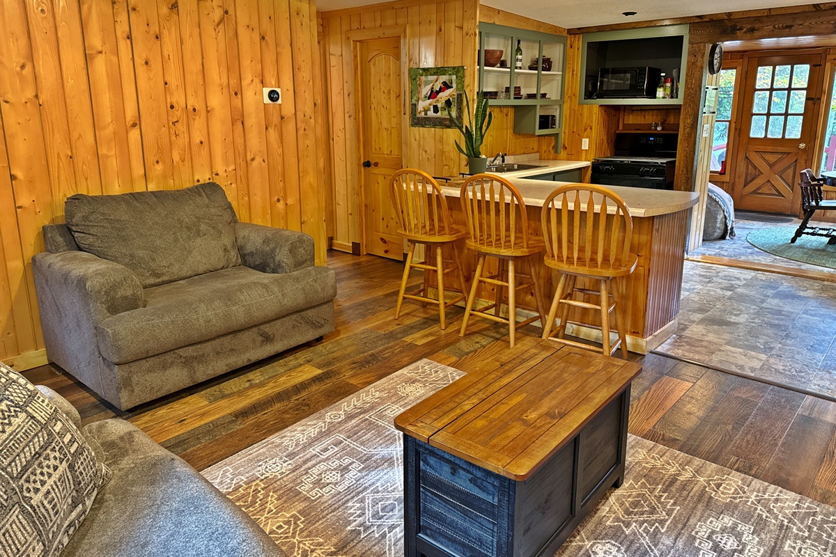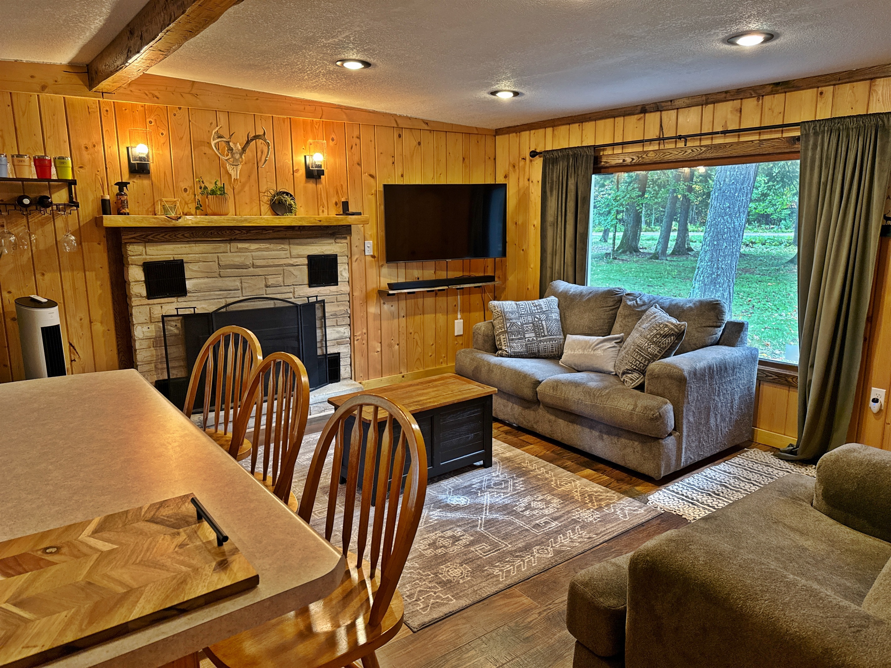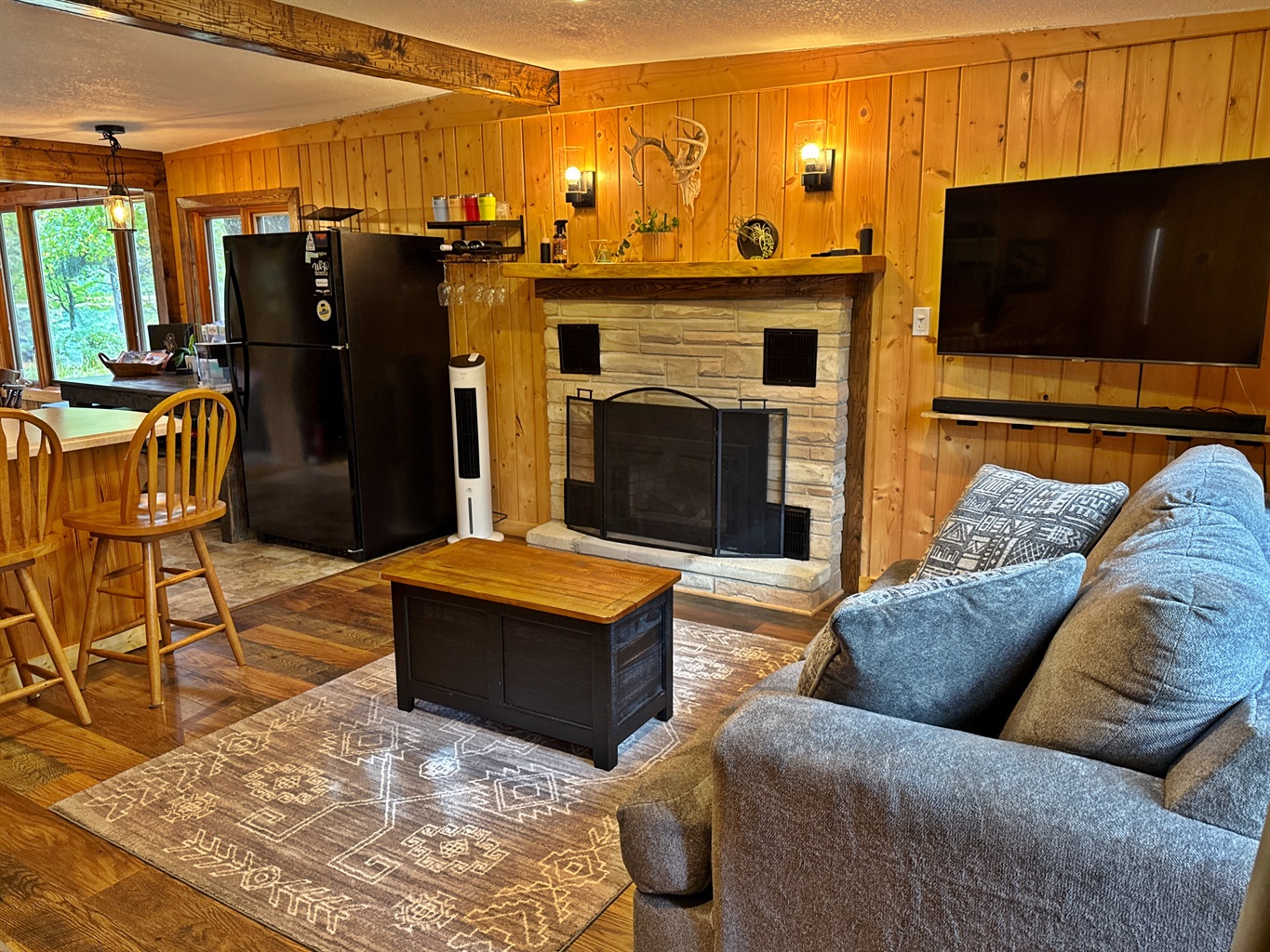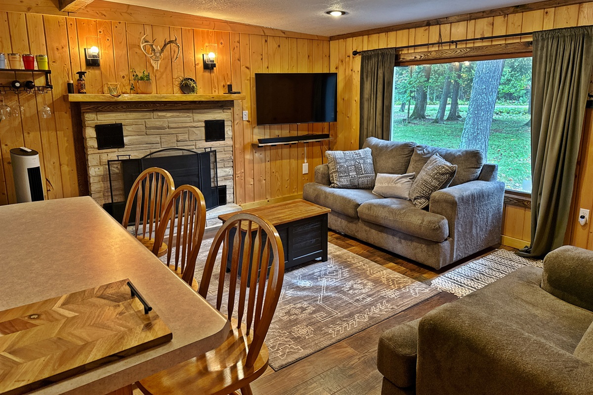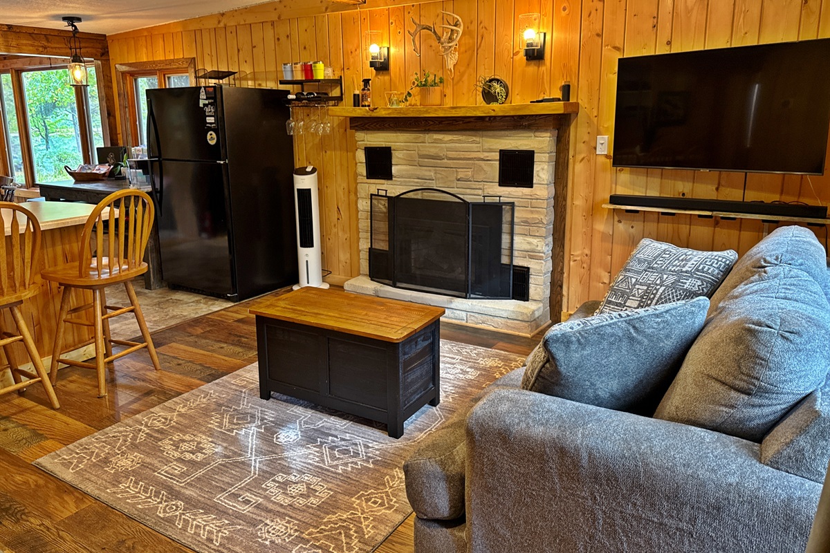 2 Bedrooms • 1 Bathroom 1 Bath • Sleeps 1-5This beautifully updated 2-bedroom, 1-bath cabin offers an open layout designed for comfort and privacy — the bedrooms don’t share walls, making it perfect for families or friends. Inside, you’ll find new appliances (including a washer and dryer), a Smart TV, and even a fun icee/slushy maker for summer treats.